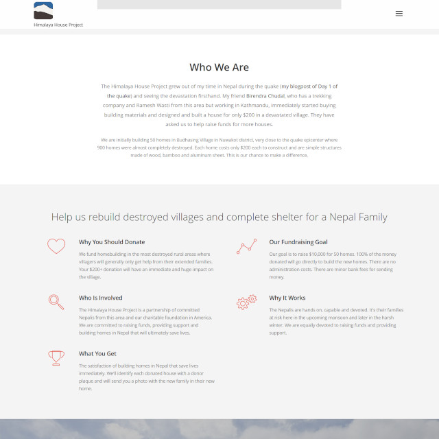Following a 7.6 magnitude earthquake that damaged or destroyed 3/4 of a million homes, this non-profit website and foundation was created to raise funds, provide support and rebuild homes for a Nepalese families.
